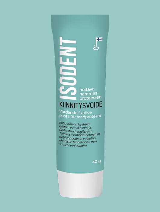 IsoDent hoitava hammasproteesien kiinnitysvoide on suomalaisen IsoDent Oy:n kehittämä ja valmistama. Sen testattu koostumus pitää proteesit paikoillaan tilanteessa kuin tilanteessa. Kiinnitysvoide edistää myös suun limakalvojen hyvinvointia. Tehoaineena arktiset yrtit. Soveltuu päivittäiseen käyttöön. Ei sisällä sinkkiä eikä keinotekoisia säilöntäaineita.