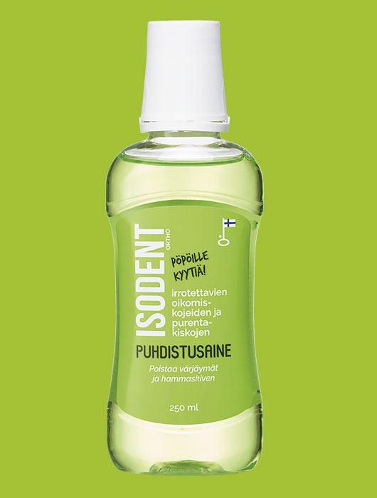 IsoDent Ortho on irrotettaville oikomiskojeille ja purentakiskoille suunniteltu tehokas ja vaivaton puhdistusaine, joka jättää jälkeensä raikkaan mintun maun. Vaikka IsoDent Ortho on armoton pinttymille, sienikasvustoille ja bakteereille, se on hellävarainen itse oikomiskojeelle. Siksi sitä voi käyttää vaikka päivittäin.
