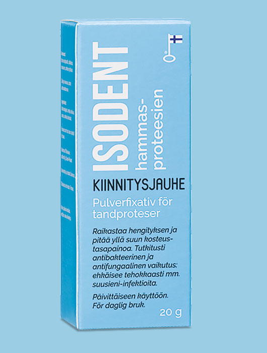 IsoDent hammasproteesien kiinnitysjauhe sisältää arktista yrttiuutetta, jonka suun terveyttä edistävät vaikutukset (antibakteerisuus ja antifungaalisuus) on testattu yhteistyössä hammaslääkäreiden kanssa. Huomaathan, että huonosti istuva proteesi ei pysy paikoillaan kiinnitysaineen käytöstä huolimatta ja voi heikentää terveyttäsi. Käy tarkistuttamassa proteesin kunto ja istuvuus säännöllisesti hammaslääkärillä tai erikoishammasteknikolla.